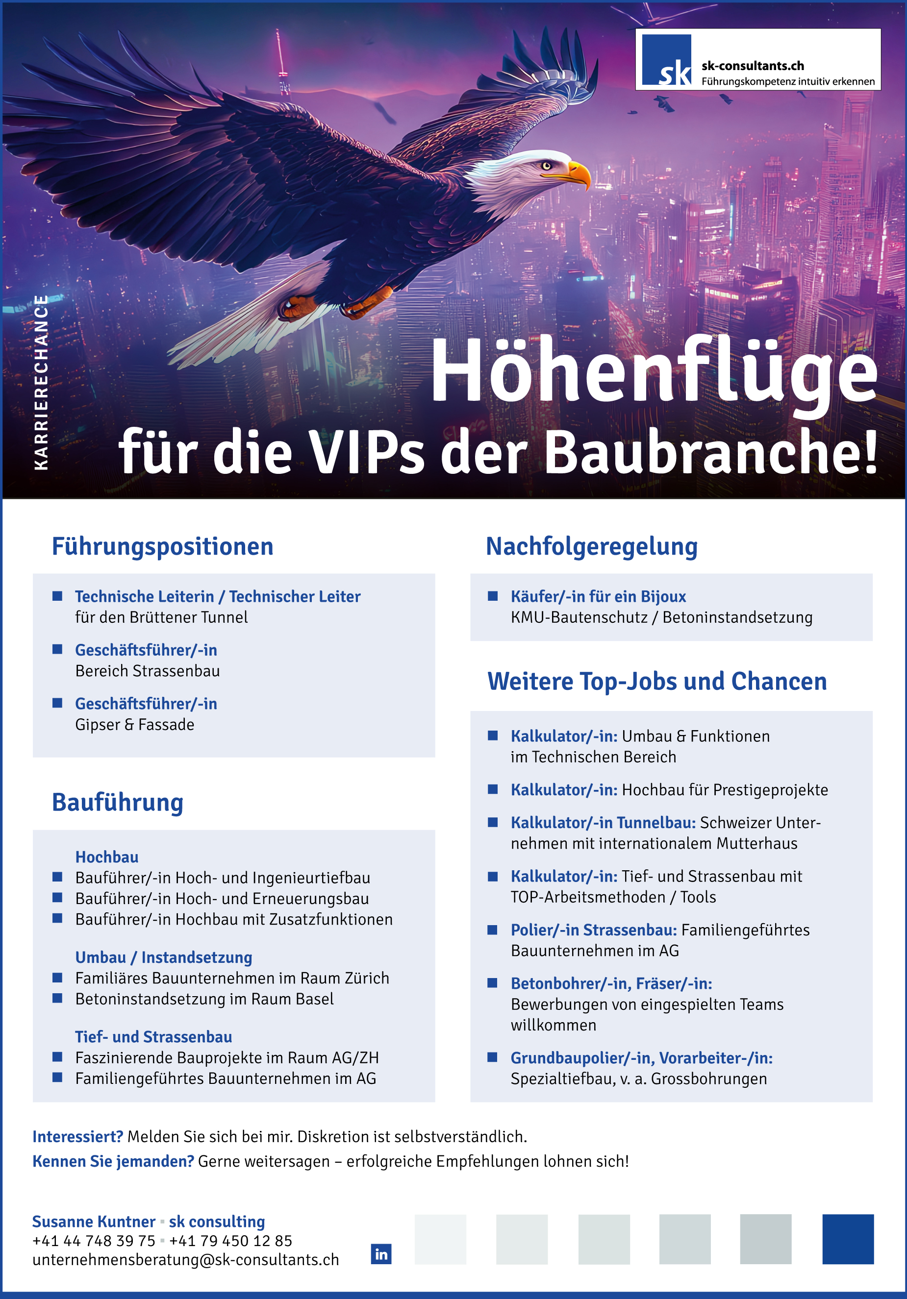 Da nicht jede offene Position umgehend in einem Inserat ausgeschrieben wird, dürfen Sie gerne auch telefonisch (+41 44 748 39 75) oder per Mail an unternehmensberatung@sk-consultants.ch bei uns nachfragen.